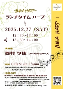 2025.11.20 2025年12月27日(土 ) ランチタイムハープ 画像をクリックすると拡大します タイトル 本郷台カフェ ランチタイムハープ 日時 2025年12月27日(土) 12:30~13:00,13:30~14:00 会場 Cafe&Bar T’amo アクセス 本郷台駅前 ピーコックストア裏 詳細 詳しくはチラシをご覧下さい。 >> チラシを見る お問合せ・主催 株式会社ルナハープ 0120-235-802 / info@luna-harp.com