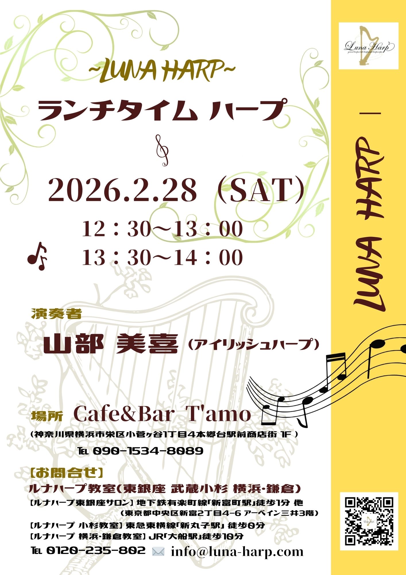 2026.01.05 2026年2月28日(土) ランチタイムハープ 画像をクリックすると拡大します タイトル 本郷台カフェ ランチタイムハープ 日時 2026年2月28日(土) 12:30~13:00,13:30~14:00 会場 Cafe&Bar T’amo アクセス 本郷台駅前 ピーコックストア裏 詳細 詳しくはチラシをご覧下さい。 >> チラシを見る お問合せ・主催 株式会社ルナハープ 0120-235-802 / info@luna-harp.com